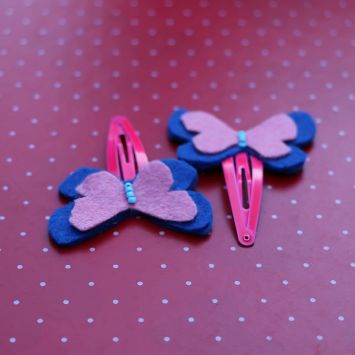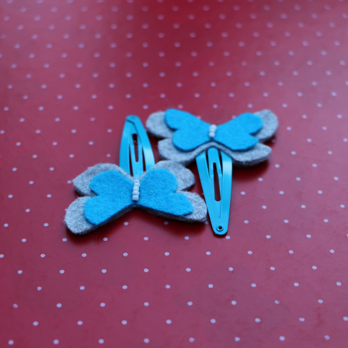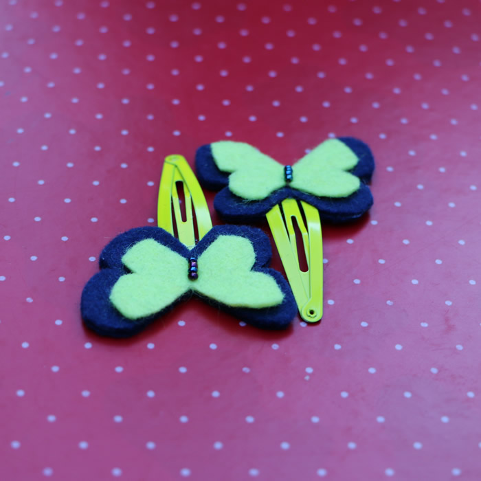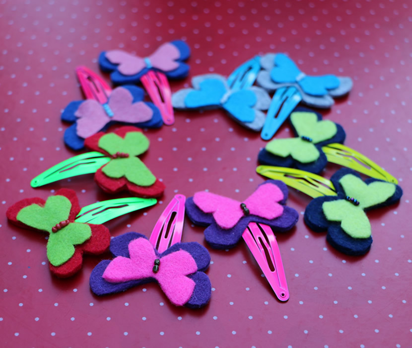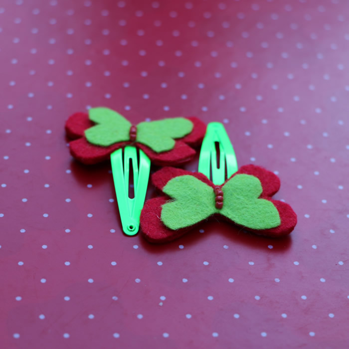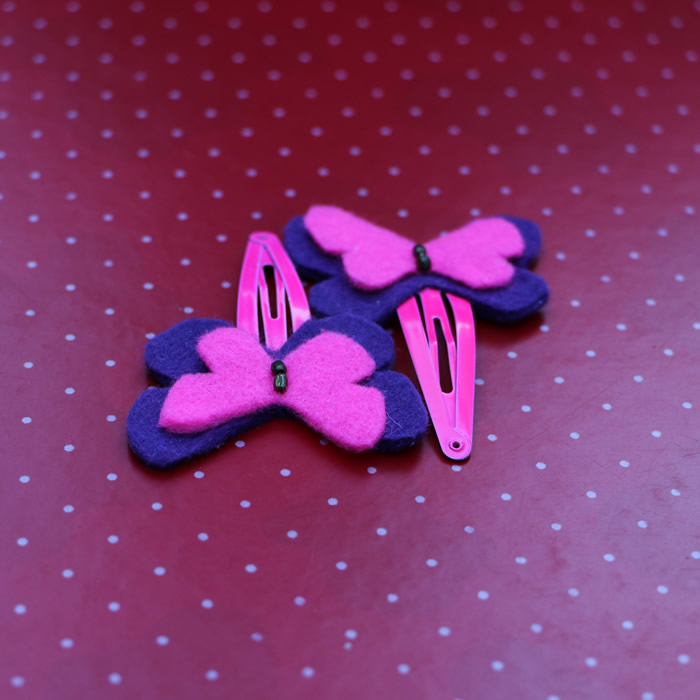 This listing is for a set of four assorted beautiful butterflies, strongly attached to matching hair pins. This very cute set of felt hair pins would be great for holding little girls hair back or just to be added as a perfect accessory. Each Butterfly comes in two different tones and the colours can be changed if desired . The bigger butterfly measures 4.5 cm( 1.8″ ) and the small one 3.5 cm(1.5″ ).