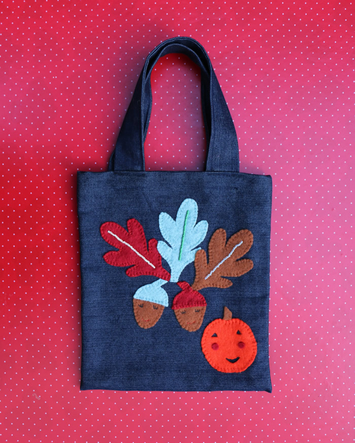 This little tote bag is made out of denim fabric and craft felt in red, brown, orange and grey but the appliqués colours can be changed . The autumn leaves have a row of beads in the middle and It is fully lined with a brown cotton fabric so that the form is protected.